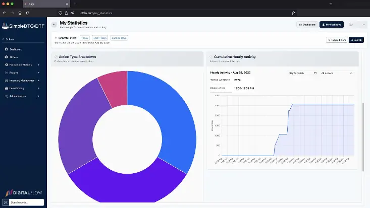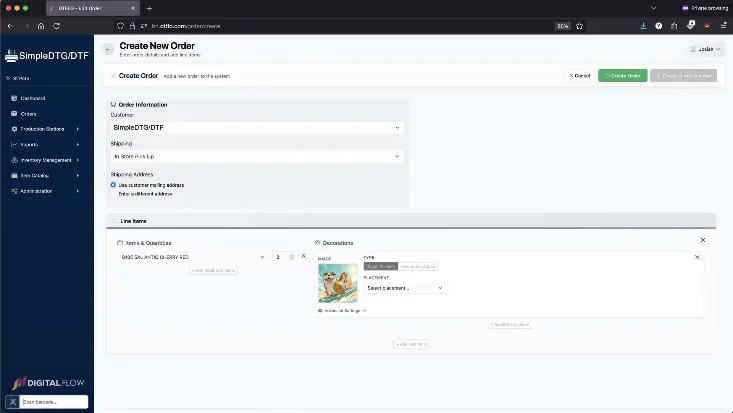 Digital Flow simplifies and centralizes your order management process from start to finish. Whether you're handling bulk fulfillment or single orders, our system ensures smooth intake through automated syncing with your e-commerce platforms. Each order is tracked in real time using QR or barcode scanning, allowing for precise production updates, inventory checks, and shipping status.